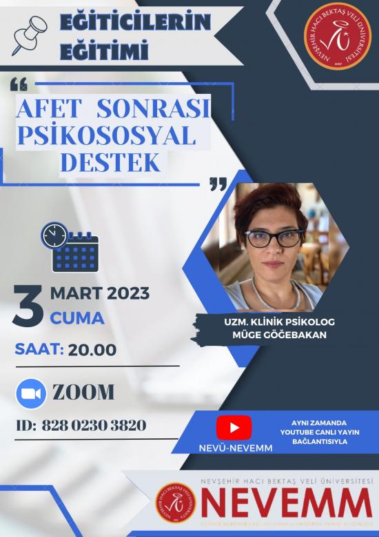 Üniversitemiz Eğitimde Mükemmeliyet Araştırma ve Uygulama Merkezi’nin (NEVEMM) davetiyle Eğiticilerin Eğitimi kapsamında Uzm. Klinik Psk. Müge GÖĞEBAKAN tarafından Üniversitemiz öğretim elemanlarına yönelik uzaktan canlı bağlantı ile “Afet Sonrası Psikososyal Destek” semineri düzenlendi.