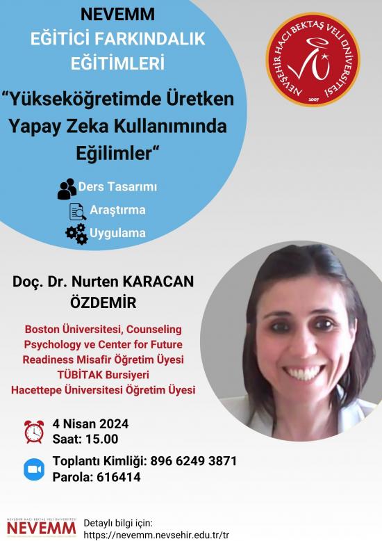 Nevşehir Hacı Bektaş Veli Üniversitesi (NEVÜ) Eğitimde Mükemmeliyet Uygulama ve Araştırma Merkezi (NEVEMM) tarafından üniversitemiz akademik personeline yönelik hazırlanan NEVEMM Eğitici Farkındalık Eğitimleri, 4 Nisan 2024 Perşembe günü saat 15:00’da “Yükseköğretimde Üretken Yapay Zeka Kullanımında Eğilimler” konulu eğitim ile devam edecektir.