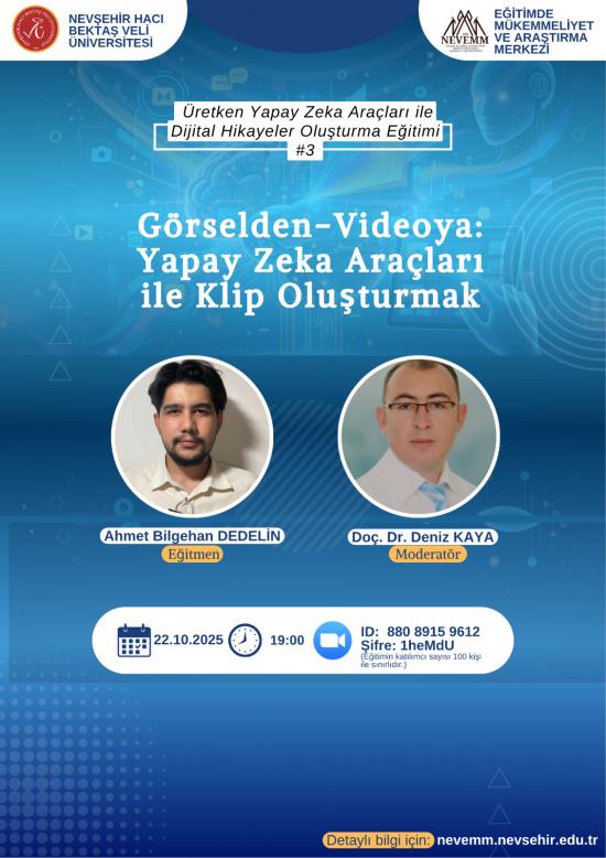 Nevşehir Hacı Bektaş Veli Üniversitesi Eğitimde Mükemmeliyet Uygulama ve Araştırma Merkezi (NEVEMM) koordinesinde, lisans öğrencilerine yönelik “Görselden-Videoya: Yapay Zeka Araçları ile Klip Oluşturmak” başlıklı çevrim içi eğitim serisinin üçüncü oturumu, 22 Ekim 2025 Çarşamba günü saat 19:00’da gerçekleştirilecektir.