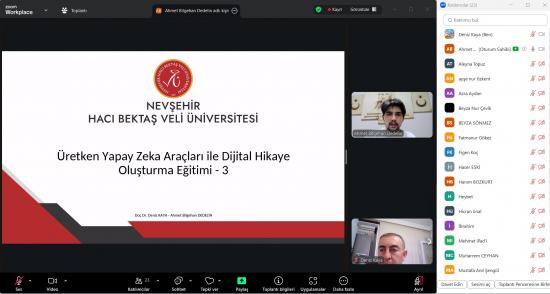 Nevşehir Hacı Bektaş Veli Üniversitesi Eğitimde Mükemmeliyet Uygulama ve Araştırma Merkezi (NEVEMM) tarafından düzenlenen çevrim içi eğitim serisinin üçüncü oturumu, 22 Ekim 2025 Çarşamba günü “Görselden-Videoya: Yapay Zeka Araçları ile Klip Oluşturmak” başlığıyla gerçekleştirildi. Eğitmenliğini Ahmet Bilgehan Dedelin’in, moderatörlüğünü ise Doç. Dr. Deniz Kaya’nın üstlendiği oturumda; görsel içeriklerin üretken yapay zekâ araçları kullanılarak senaryo bütünlüğü içinde video kliplere dönüştürülme süreci uygulamalı olarak ele alındı. Katılımcılar, görselden videoya dönüşüm sağlayan çeşitli yapay zekâ platformlarının işlevlerini deneyimleme ve kendi özgün içeriklerini oluşturma fırsatı buldu.