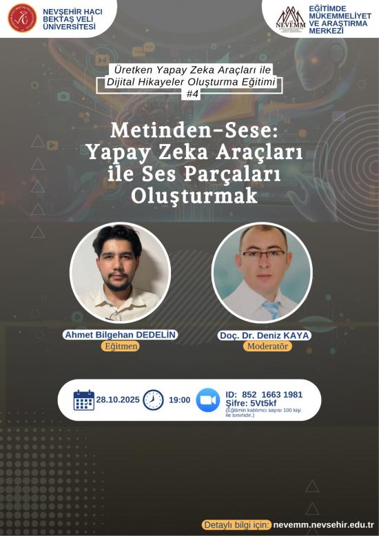 Nevşehir Hacı Bektaş Veli Üniversitesi Eğitimde Mükemmeliyet Uygulama ve Araştırma Merkezi (NEVEMM) koordinesinde, lisans öğrencilerine yönelik “Metinden-Sese: Yapay Zeka Araçları ile Ses Parçaları Oluşturmak” başlıklı çevrim içi eğitim serisinin dördüncü oturumu, 28 Ekim 2025 Salı günü saat 19:00’da gerçekleştirilecektir.