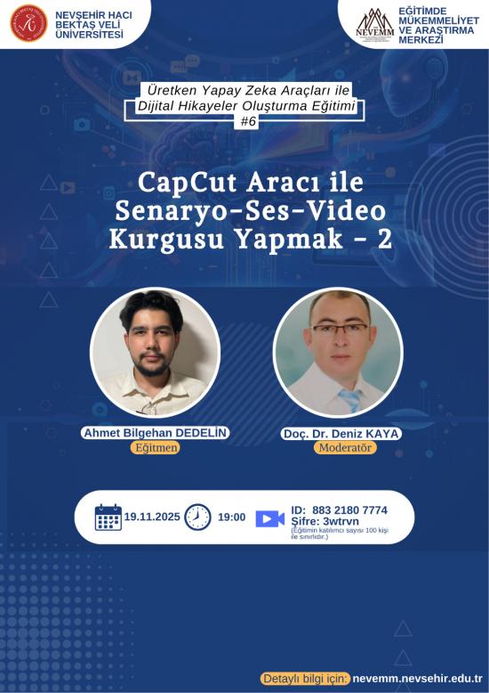 Nevşehir Hacı Bektaş Veli Üniversitesi Eğitimde Mükemmeliyet Uygulama ve Araştırma Merkezi (NEVEMM) koordinesinde, lisans öğrencilerine yönelik “CapCut Aracı ile Senaryo-Ses-Video Kurgusu Yapmak #2” başlıklı çevrim içi eğitim serisinin altıncı oturumu, 19 Kasım 2025 Çarşamba günü saat 19:00’da gerçekleştirilecektir.