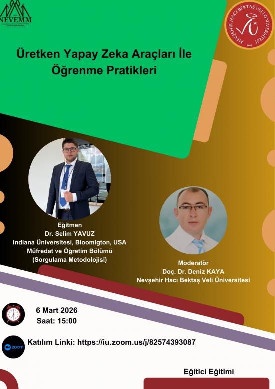 Nevşehir Hacı Bektaş Veli Üniversitesi (NEVÜ) Eğitimde Mükemmeliyet Uygulama ve Araştırma Merkezi (NEVEMM) tarafından düzenlenen NEVEMM Eğitici Farkındalık Eğitimleri, 6 Mart 2026 Cuma günü saat 15:00’te çevrim içi olarak gerçekleştirilecek “Üretken Yapay Zeka Araçları ile Öğrenme Pratikleri” başlıklı eğitimle devam edecektir.